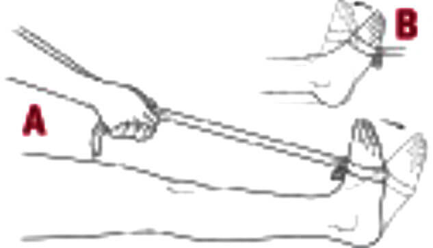 (А) Закрепите на стопе эластичную ленту или трубку, аккуратно удерживая ее, сгибайте и разгибайте стопу. Повторяйте это упражнение в течение 1-2 мин. (B) Привяжите один конец ленты к ножке стола или стула, закрепите другой конец на вашей ноге и медленно тяните стопу на себя и от себя, также выполняйте это упражнение в течение 1-2 минут.