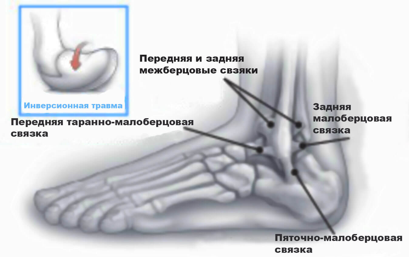 Наиболее распространенный тип растяжения связок голеностопного сустава — инверсионная травма стопы или боковое растяжение связок голеностопного сустава. Нога, перекатившись внутрь, повреждает переднюю таранно-малоберцовую связку, пяточно-малоберцовую связку и заднюю таранно-малоберцовую связку.
